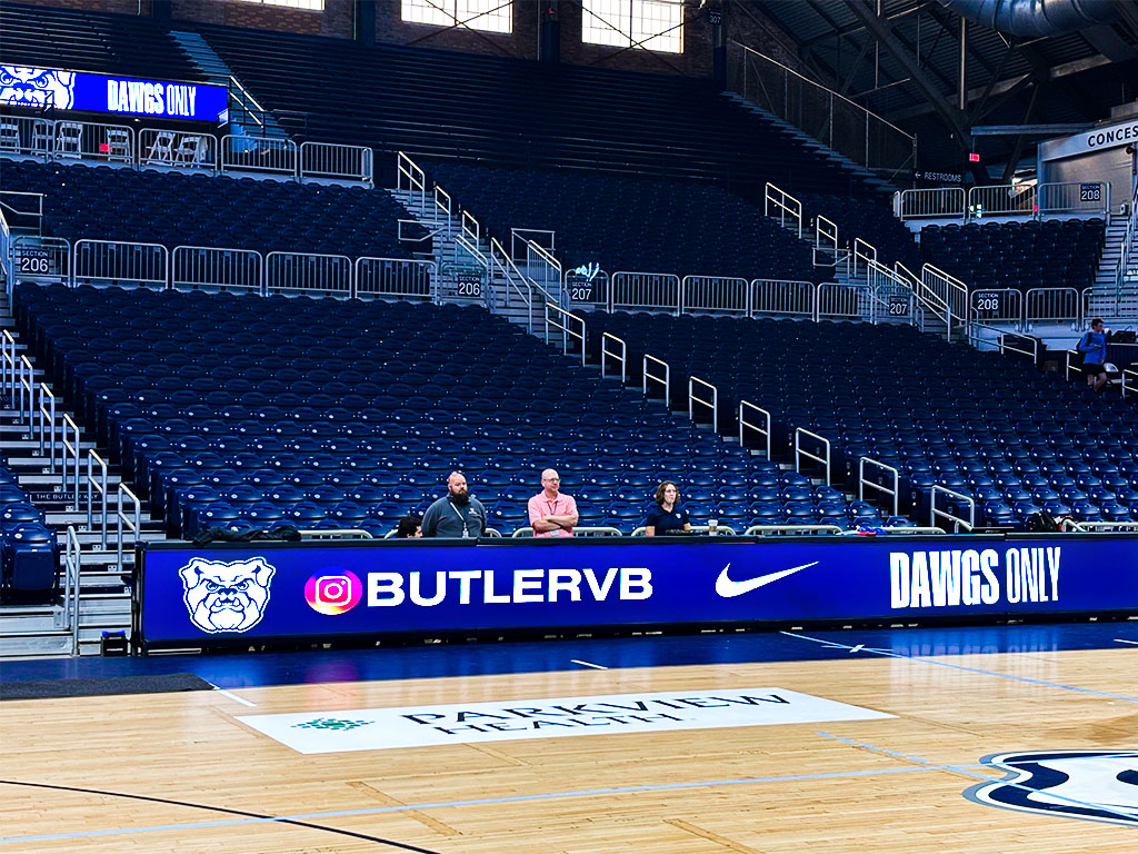 Technology consultant Anthony James Partners (AJP) provided design, procurement, and construction administration services for the upgrades, supporting Butler in selecting SNA Displays to manufacture and install nearly 2,800 square feet of LED video display technology, including a center-hung display system, baseline LED ribbons, multiple courtside scorer’s tables, and more. SNA Displays also provided demolition and removal services for the venue’s outdated technology.