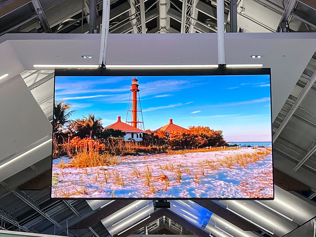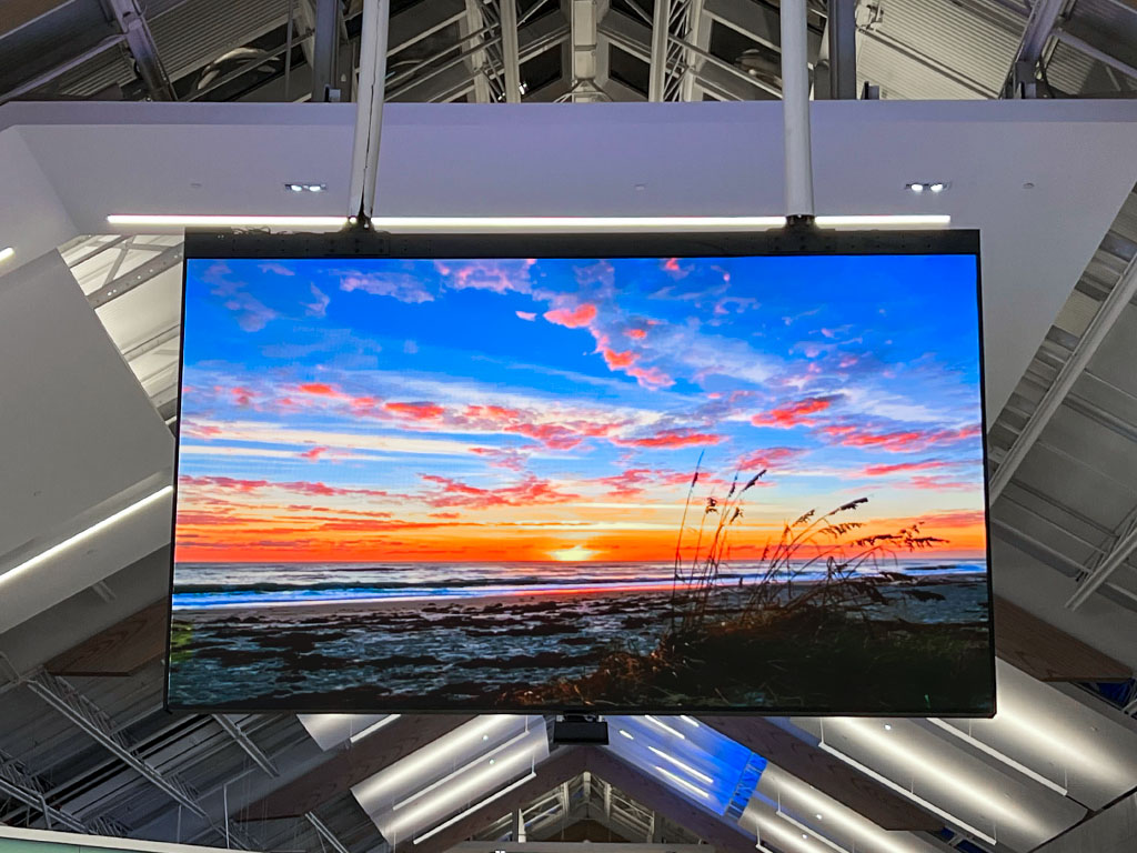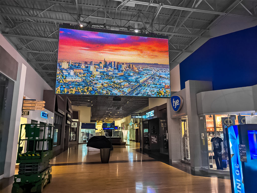 Used primarily for promotional and advertising content for retail tenants, the LED screens are hung from ceilings at major traffic points within the shopping center. Each screen face measures 9’ tall x 15’7” wide (704 x 1,216 pixels) and processes more than 850,000 pixels.