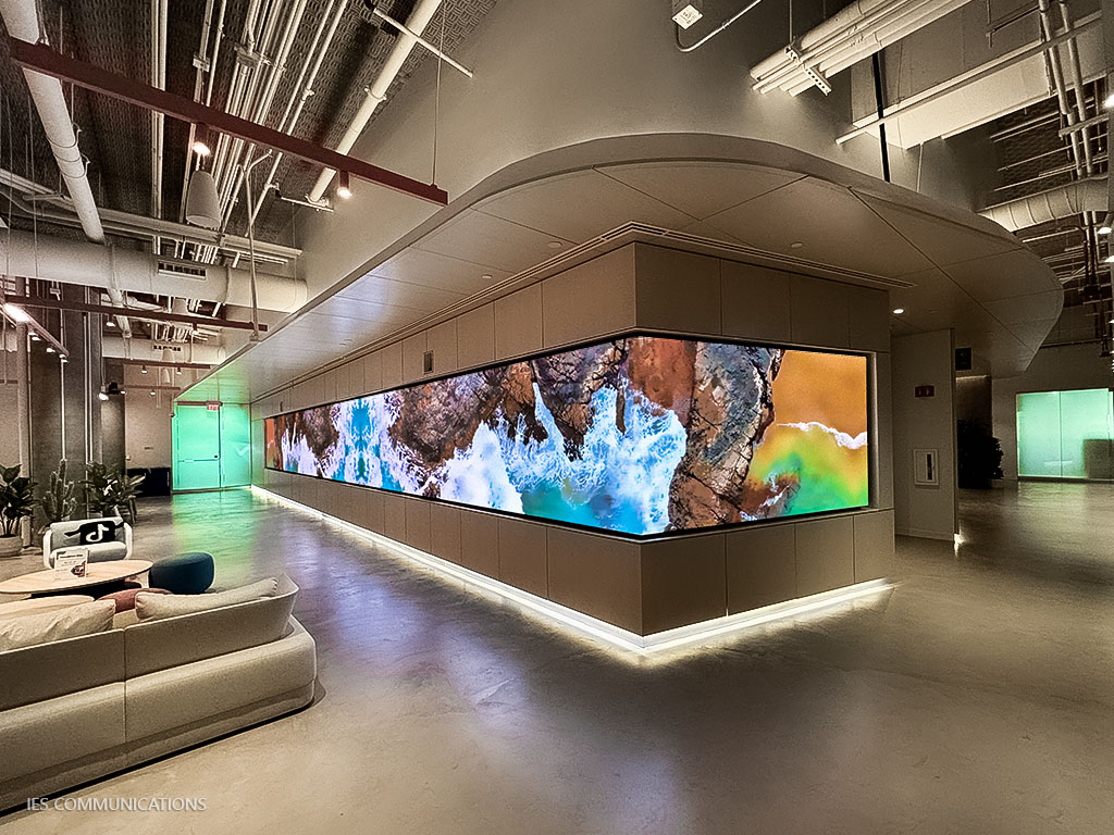 SNA Displays gave TikTok’s Scottsdale, Arizona, office a digital upgrade using tight-pitch LED video technology. The corner-wrap video wall serves as a digital centerpiece and features 1.2 mm BRILLIANT™ Interior LED video technology. Telecommunications service provider IES Communications oversaw the digital upgrade.