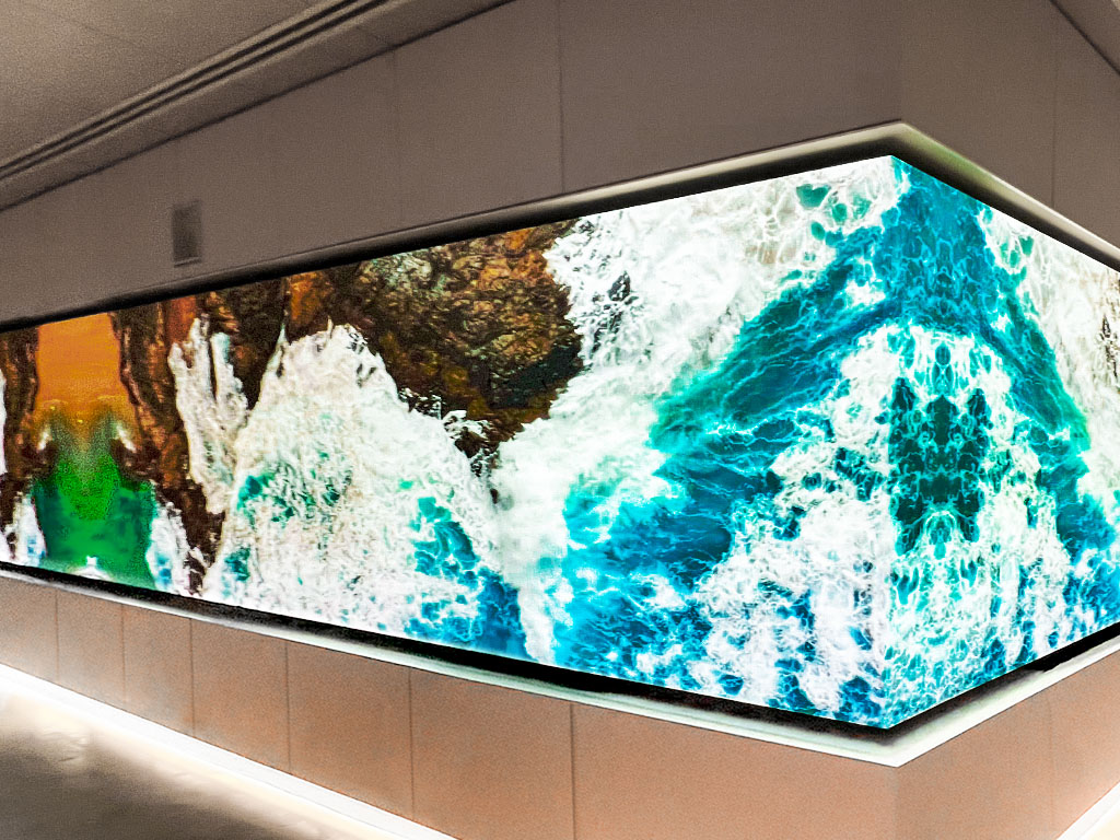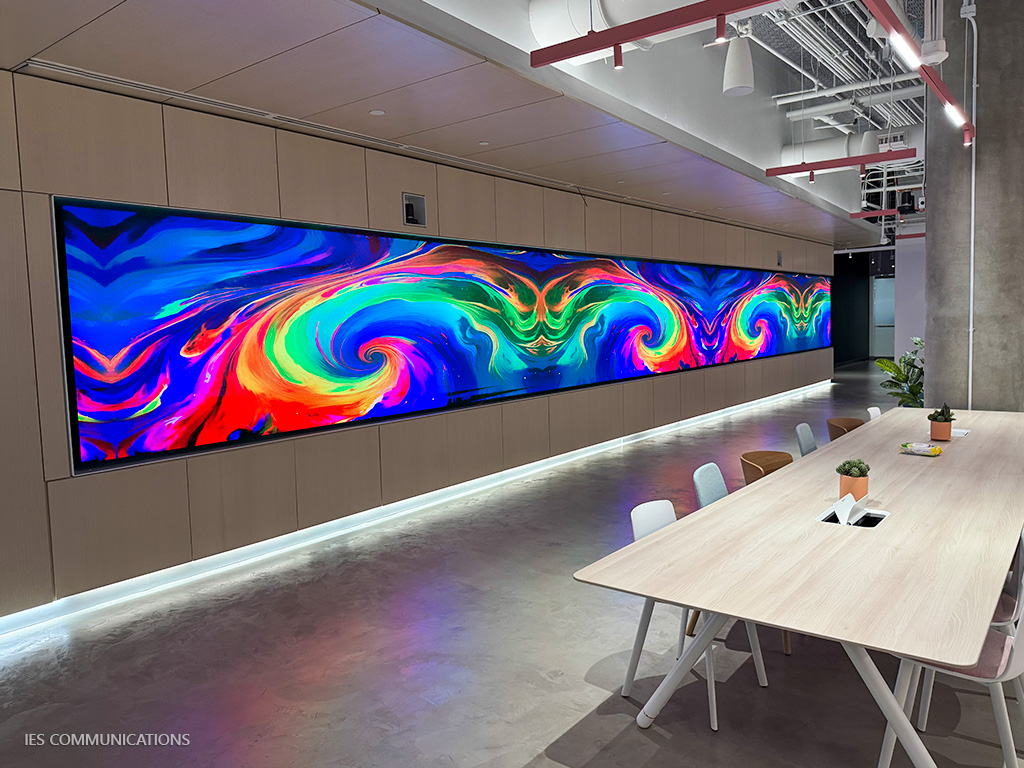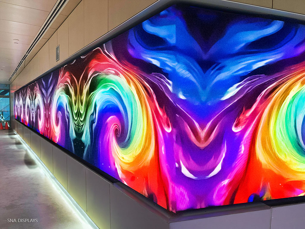 The video wall stands five feet tall and runs approximately 51 feet before making a 105-degree turn and continuing for another 9 feet. Set flush into the wall, the dvLED faces a common area and open workspace to deliver artistic content to staff and visitors at a resolution of 1,200 x 14,800 pixels. The screen processes approximately 17.8 million pixels.